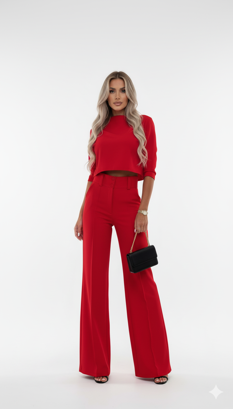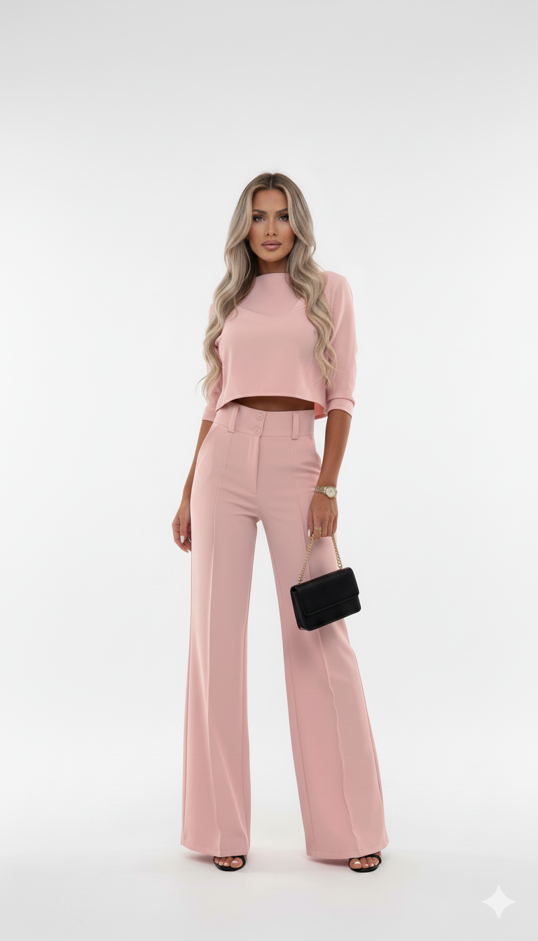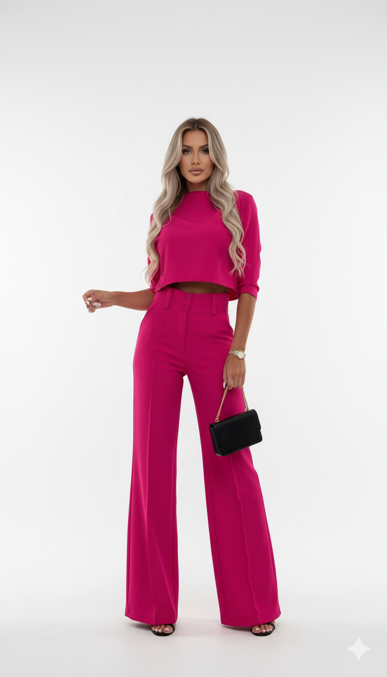 Onmiskenbaar bold, onweerstaanbaar confident. Deze Fuchsia High-Neck Crop & Tailored Pants Set in vibrant hot pink is pure statement dressing. De moderne crop top met hoge hals gecombineerd met impeccably tailored high-waist broek creëert een look die commanding, contemporary en absolutely fearless is — een set voor wie niet bang is om alle aandacht te claimen.